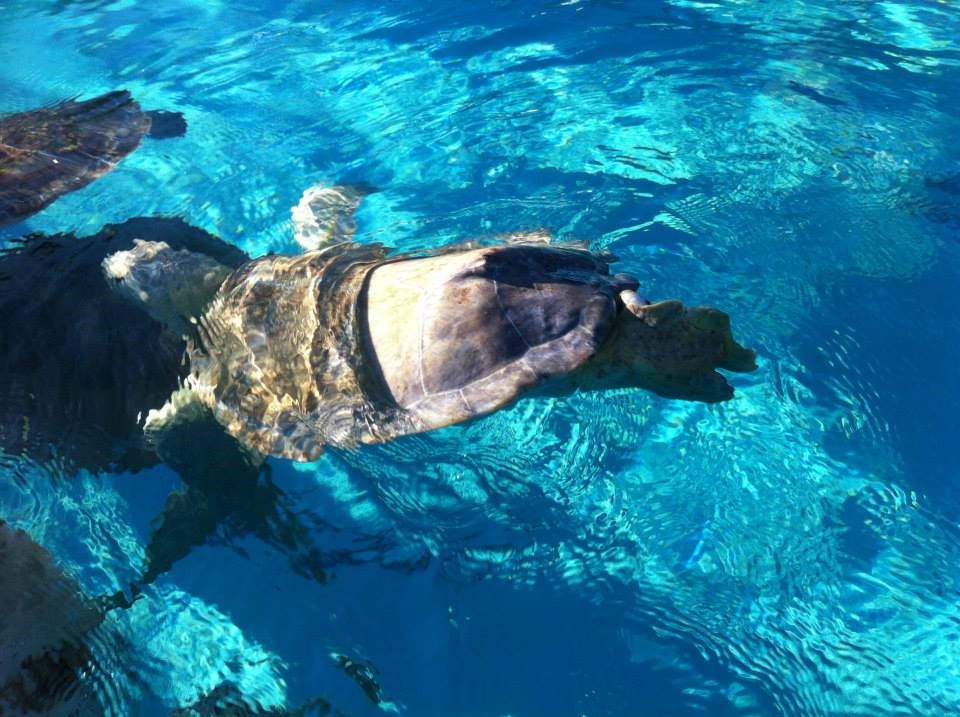 Hit by a boat, Bubble Butt’s shell at the tail end has warped into a lump filled with tiny air bubbles. The result is that Bubble Butt’s rear floats on the water; he cannot dive to find food and swims around his tank with his rear shell on the surface and his head several inches below. To help with his buoyancy (and that of other, similarly damaged turtles at the hospital) weights can be glued to the shell. Unfortunately, the weights can fall off, so affected turtles can never be released back into the wild.