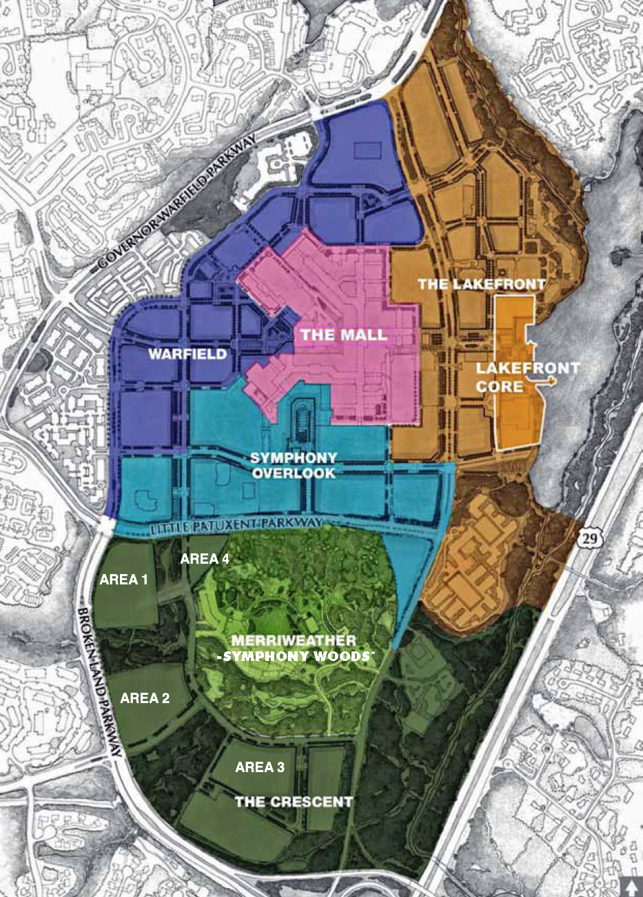 The part of downtown adjacent to Symphony Woods that is scheduled to be developed is called The Crescent. Some of this 68 acre area has served as a parking lot for Merriweather Post Pavilion. The plans call for this area to become an elaborate, mixed-use development with tall buildings as well as outdoor amenities. The goal, of course, is to make it a very people friendly and vibrant environment so it will attract tenants and consumers to its offices and shops. Columbia needs a beautiful and dynamic downtown area with a balance of woods, streams, pathways, as well as restaurants to create a healthy open air space that will attract and rejuvenate visitors and residents alike.