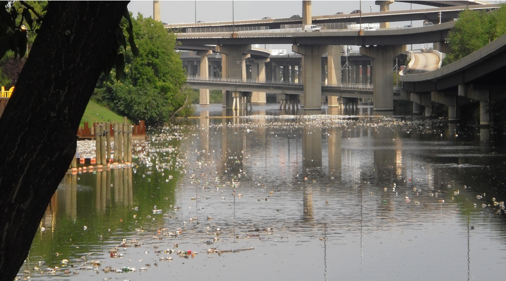 I also wondered why so many people left plastic bottles at a pet waste station? These are a great convenience to pet owners not to have to carry pet waste around with you all day. But then to leave plastic bottles here as well….What if a strong wind comes up or a heavy rainstorm? All these loose bags and bottles would end up in our streams! This is another picture that I took farther downstream on this same river.