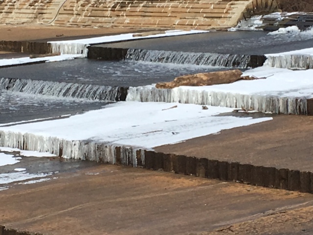 In addition to all the bird and mammal tracks I saw along the paths and on the snow covered, frozen lake, I saw this interesting trail capturing the movement of what I think was probably a duck from what is left of the open water onto the ice and then back again. Must have preferred the open water to the frozen water. Probably a mallard, since I don’t see any hooded merganzers, ringnecks, or redheads hanging around. I am also wondering how long it will be before the aeraters and their open waters get covered up.